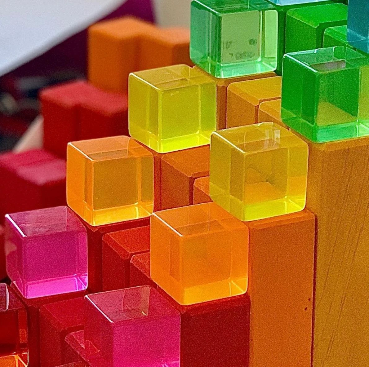 Bauspiel Lucite cubes are great to extend mathematics and science knowledge to your child. Also use light panels for a wonderful science experiment to show the effect of how light passes through the coloured cubes. The acrylic building blocks also can be submerged in water. 100 transparent lucite building blocks include 10 blocks in each of 10 different colours and each block size 2.5cm x 2.5cm x 2.5cm. The base tray size 28.5cm x 28.5cm x 2.5cm.