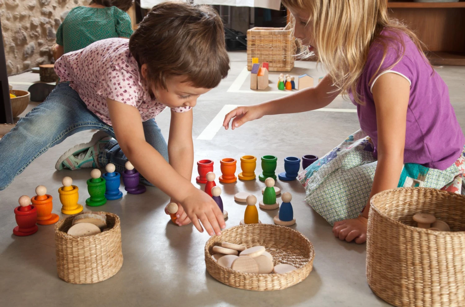 This beautifully crafted set of 18 rainbow coloured timber pieces is an open ended, loose parts toy, providing children with a tactile tool with which to discover and explore through non specific play. Fill and empty, move, sort and stack. One coin can serve to cover a mate (cup) and so hide its contents and make them disappear, Nins can hop into the mates or stack them all up in so many different ways. Simple exploratory games that help to develop, hand eye coordination, imagination, math skills and so much more.