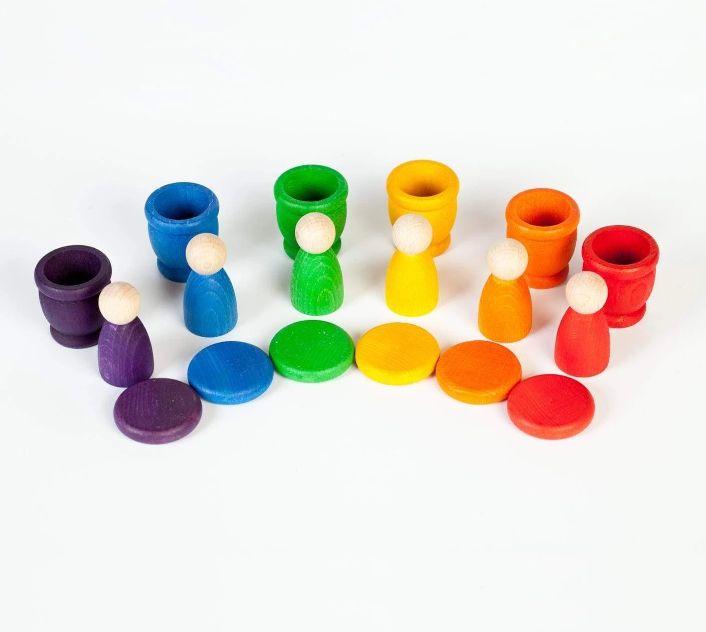 This Grapat Nins, Mates & Coins include 18 pieces in rainbow coloured timber. Contains: 6 Nins, 6 Mates and 6 Coins in 6 rainbow colours, includes cloth bag.
