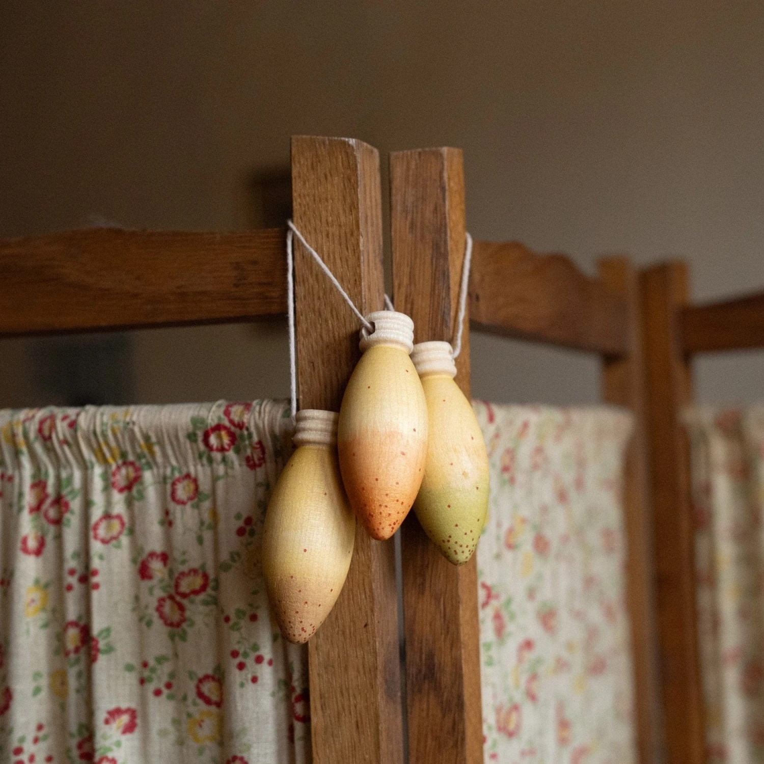 3 lamp-shaped pieces, painted by hand. Includes thread for hanging, from 68 mm height