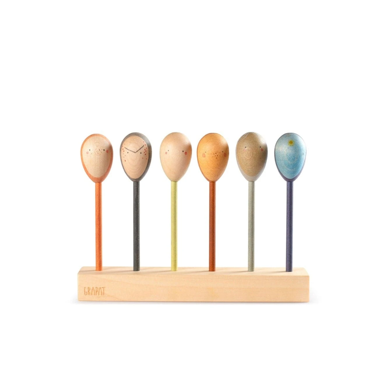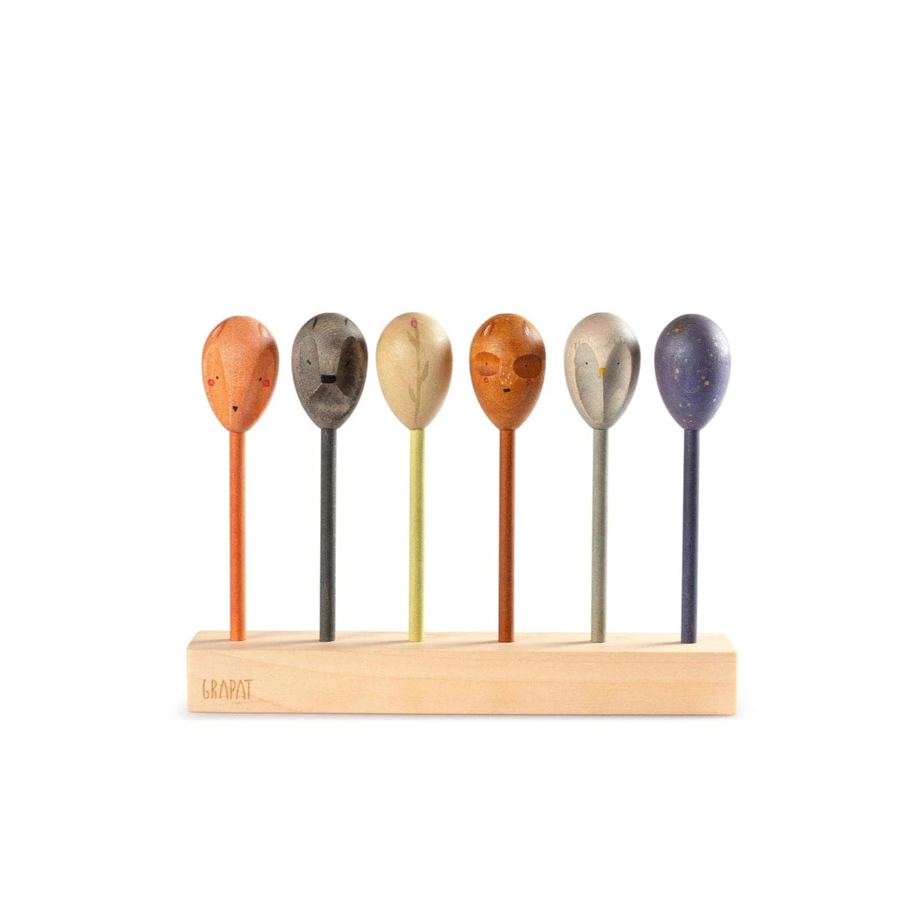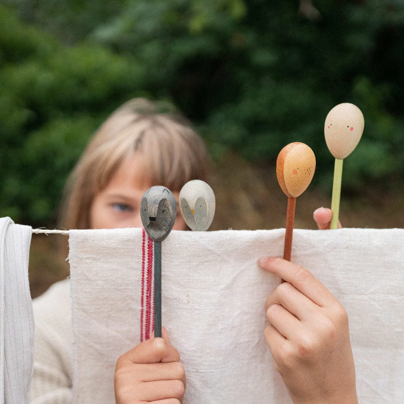 This collection of 6 double-faced puppets is perfect for inventing stories! On one side, you’ll find a little fox, a wise owl, a moon, a pretty flower, an angry wolf, and a kind bear. Flip them over, and they transform into a little boy, a wise woman, a sun, a fairy, a mischievous girl with freckles, and more!