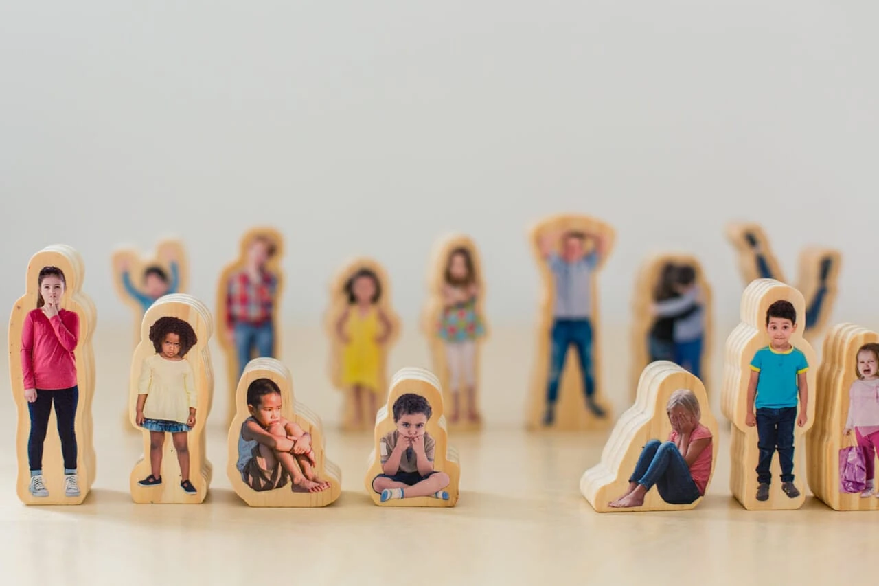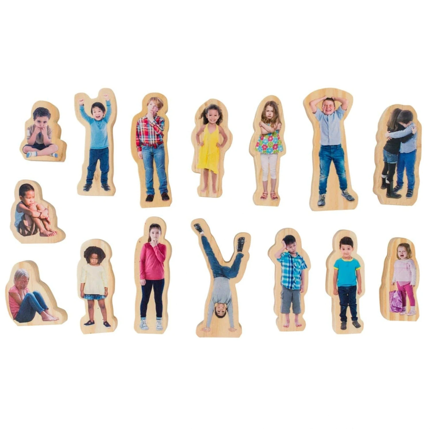 This high-quality colourful wooden set includes 15 wooden people. Each piece is printed with a photo of a child displaying a range of emotions including crying, frustration, sadness to excitement, happiness and everything in-between. This set gives children the opportunity to express and manage their own feelings, important in developing self-reliance and resilience. A fun way to introduce and recognize emotions while encouraging children to feel positive and confident while they learn through play.