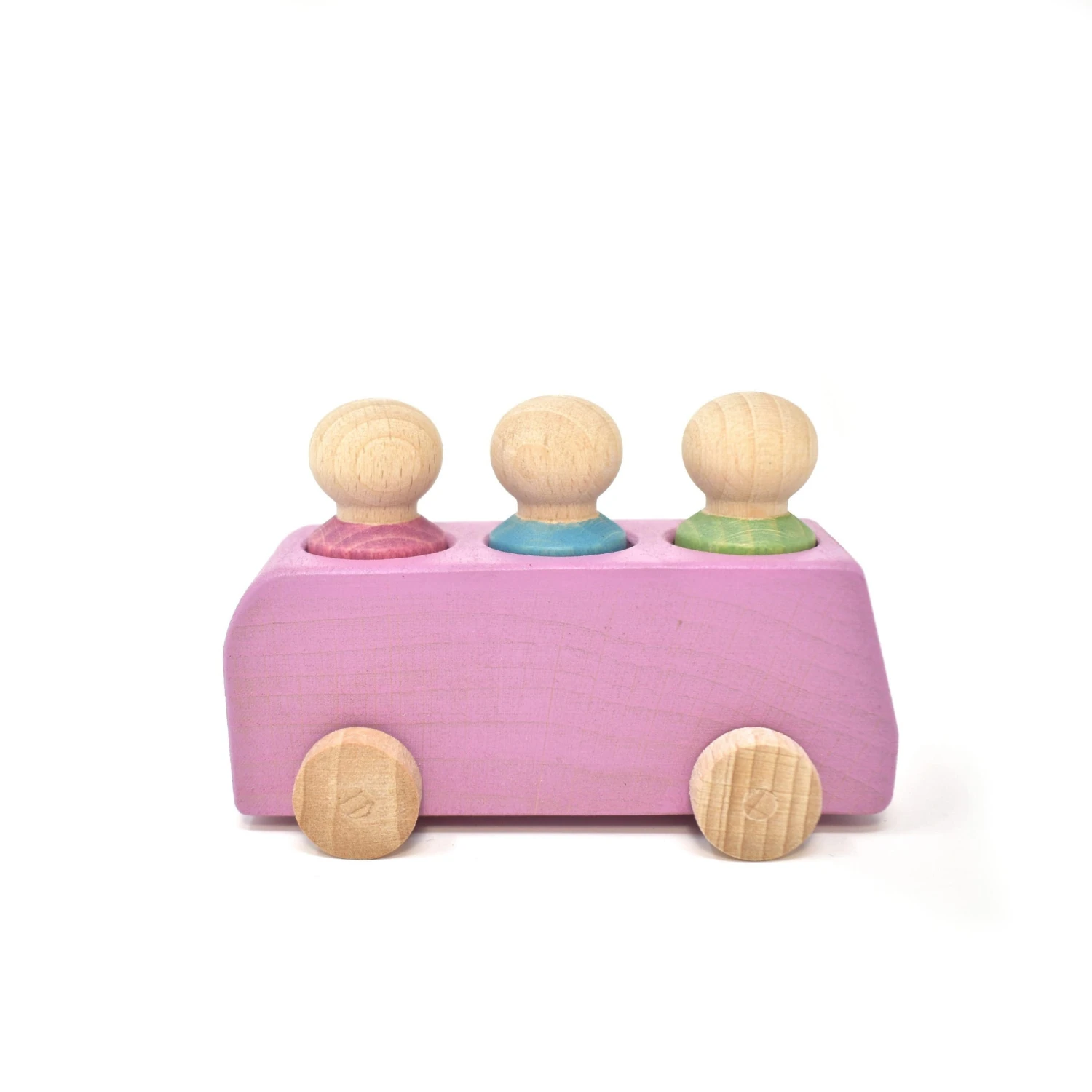 Ready to get on the bus and go for a ride around town? The Lubu buses offer space for one driver and two passengers and come with three wooden figures. The red bus comes with a blue, lime green and plum coloured figure.