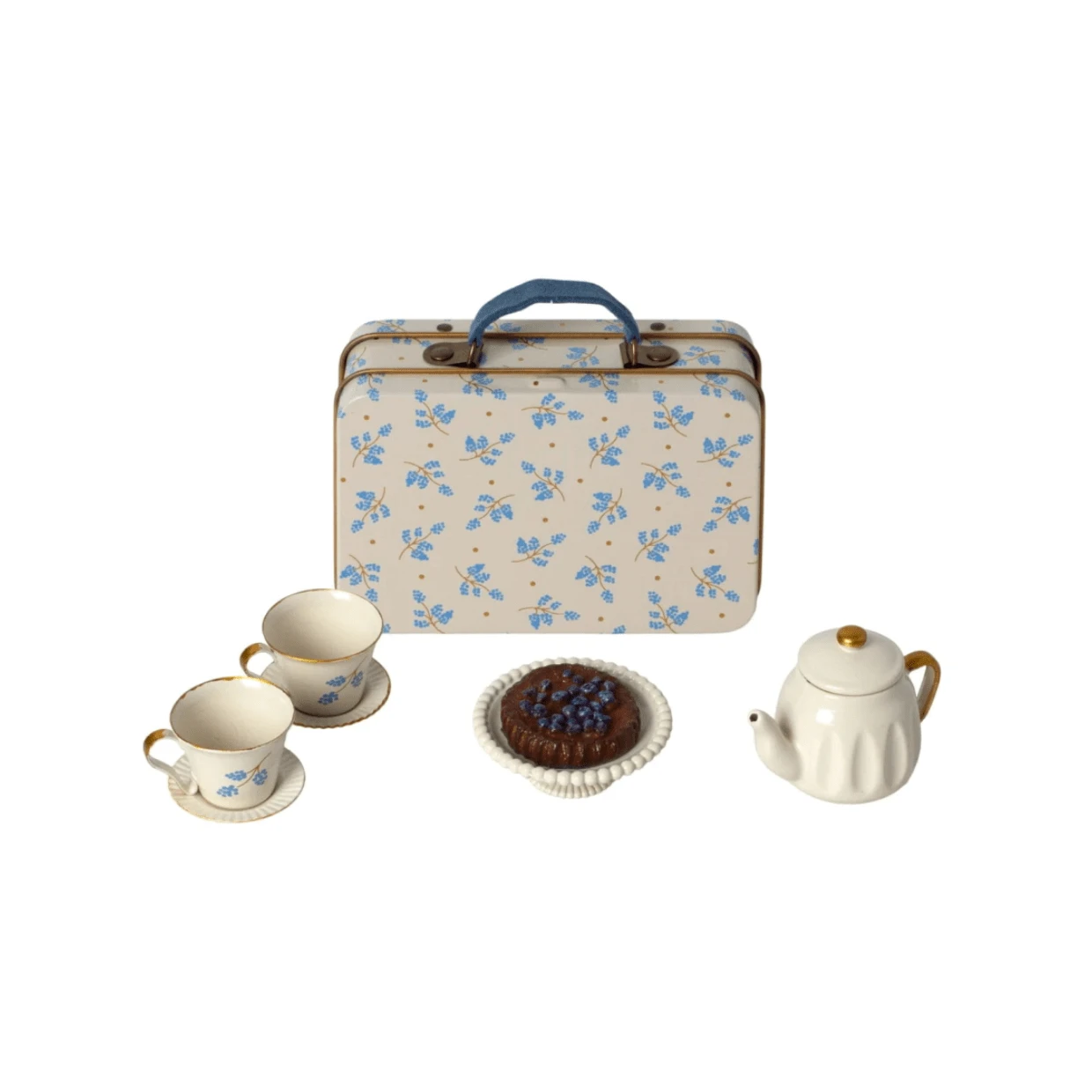 Each set includes all you need for a cosy moment with tea, cakes and tableware. It comes in a metal suitcase, beautifully decorated with Maileg print. Set includes 2 dainty matching teacups, a cake plate with madelaine and adorable mouse size teapot. We have a feeling that this is going to be a favourite addition to your Maileg Mouse collection! Also available in Purple or Merle