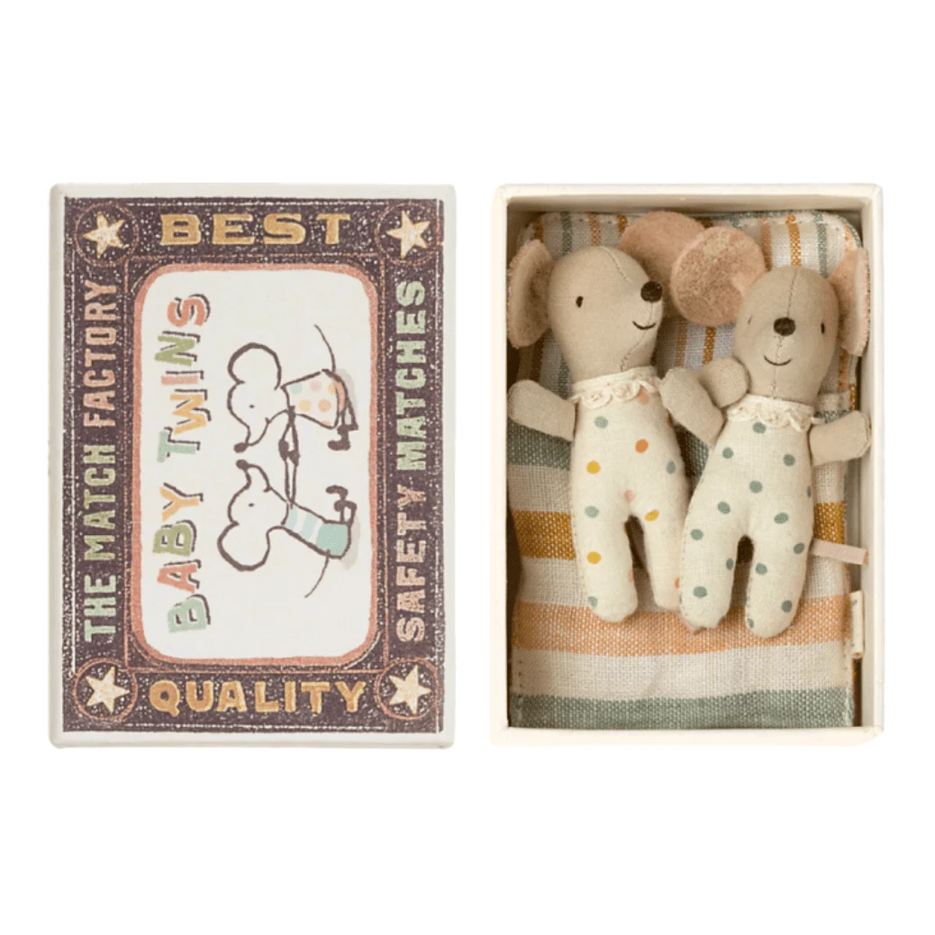 Classic Maileg merchandise. The twin mice slept safely side by side in their sleeping bags, tucked into their matchbox beds. These mice fit all accessories in small mouse sizes. Fabrics may vary.