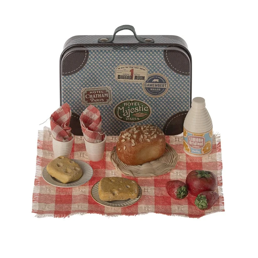 Take your Maileg friends on a picnic with this miniature play set. In the small metal suitcase comes all the food and tableware for a lovely meal. Small variations may occur in the painting. Suitcase measures L7.5cm x W6.5cm x H2.5cm.
