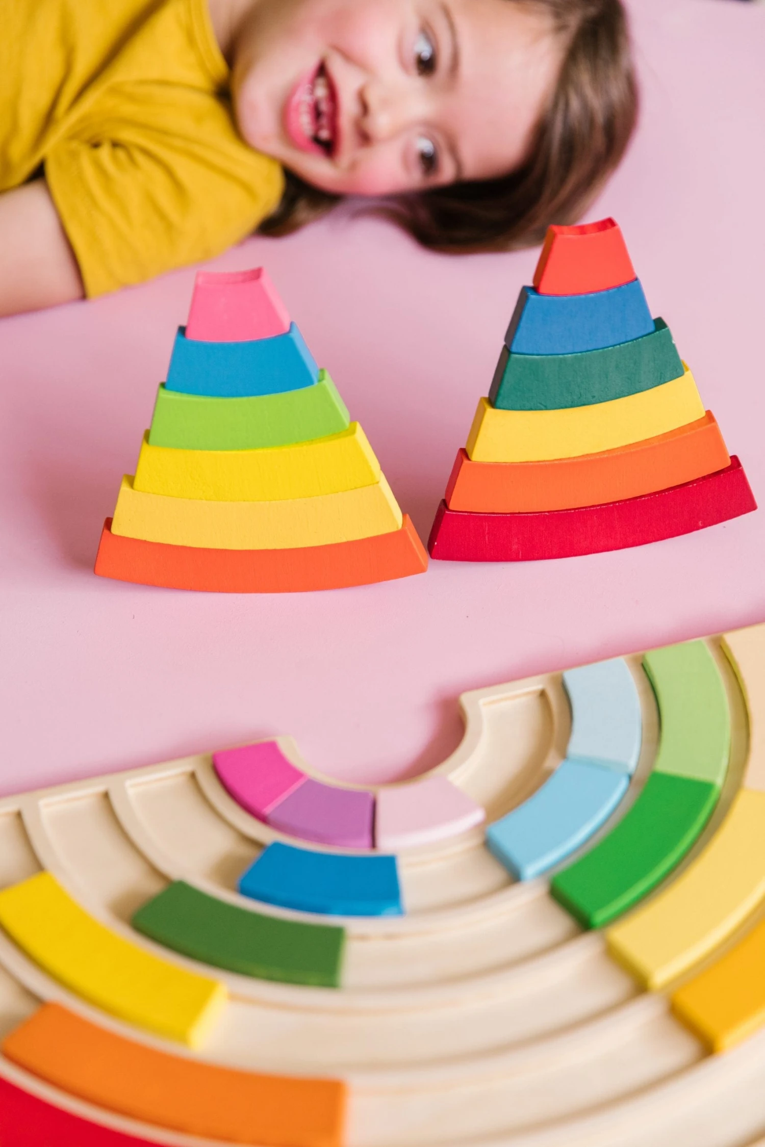 The vibrantly coloured pieces are thick enough to also allow them to be stacked or placed on the puzzle board like you would a traditional puzzle. This set contains 30 rainbow coloured pieces and a puzzle board.