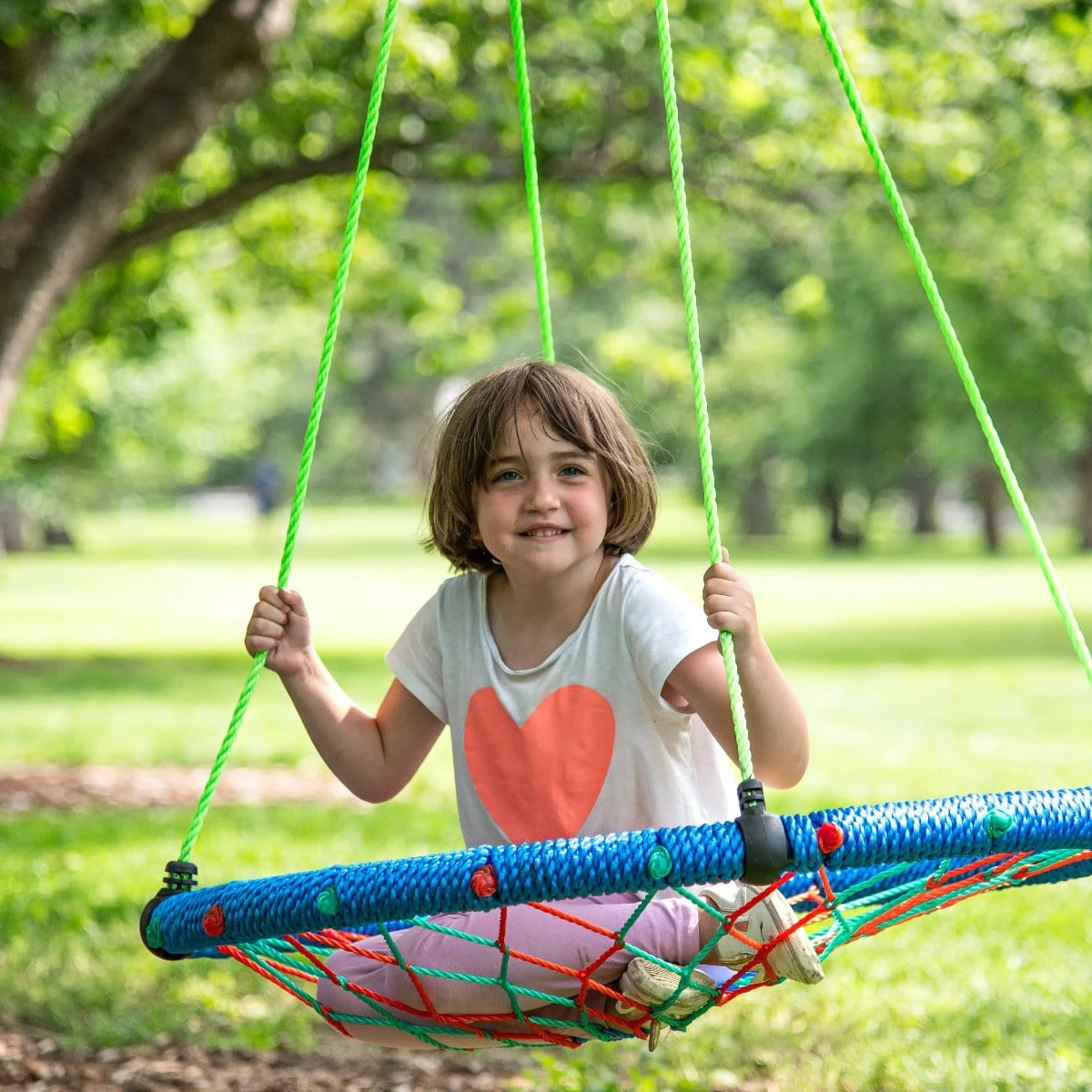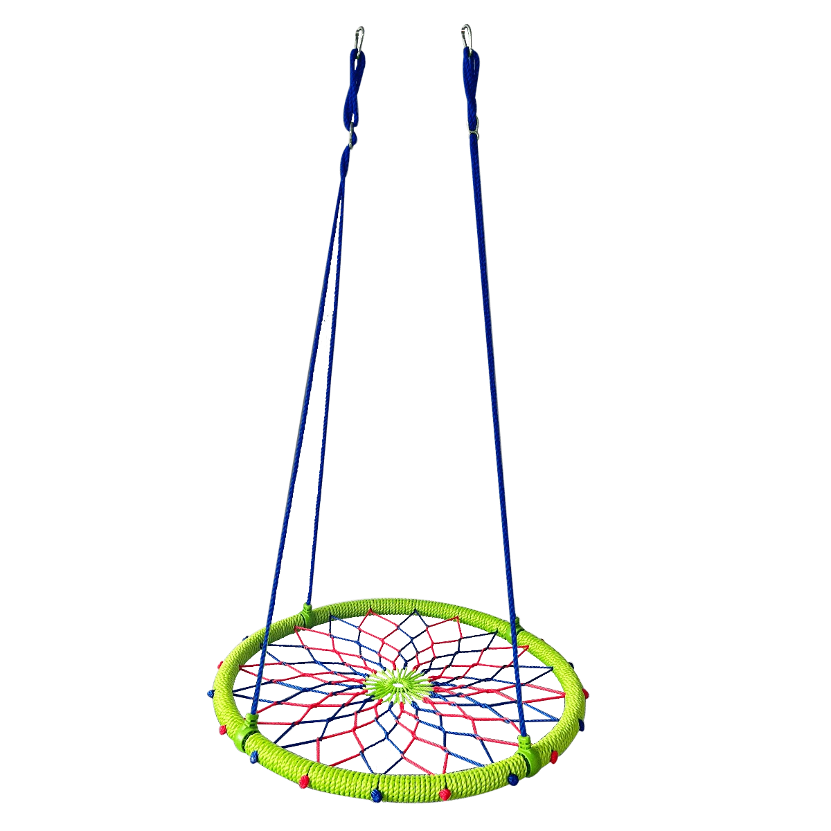 POPULAR BEST SELLER: Attractive colorful woven dreamcatcher pattern creates an enticing swing for both kids and adults! Simple snap together assembly. Made with a core steel ring, heavy dusty adjustable PE UV resistant ropes, hanging carabiners.